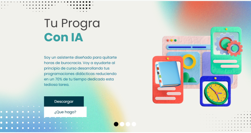 Tu Progra Con IA é unha plataforma pensada para o profesorado español que permite elaborar programacións didácticas de maneira rápida e automatizada, reducindo ata un 70 % do tempo normalmente dedicado a esta tarefa. A aplicación integra directamente o marco normativo de cada comunidade autónoma e ofrece a posibilidade de personalizar os apartados segundo a materia e o nivel educativo. Tamén xera de forma automática táboas de unidades didácticas ou situacións de aprendizaxe a partir do currículo oficial de cada territorio.